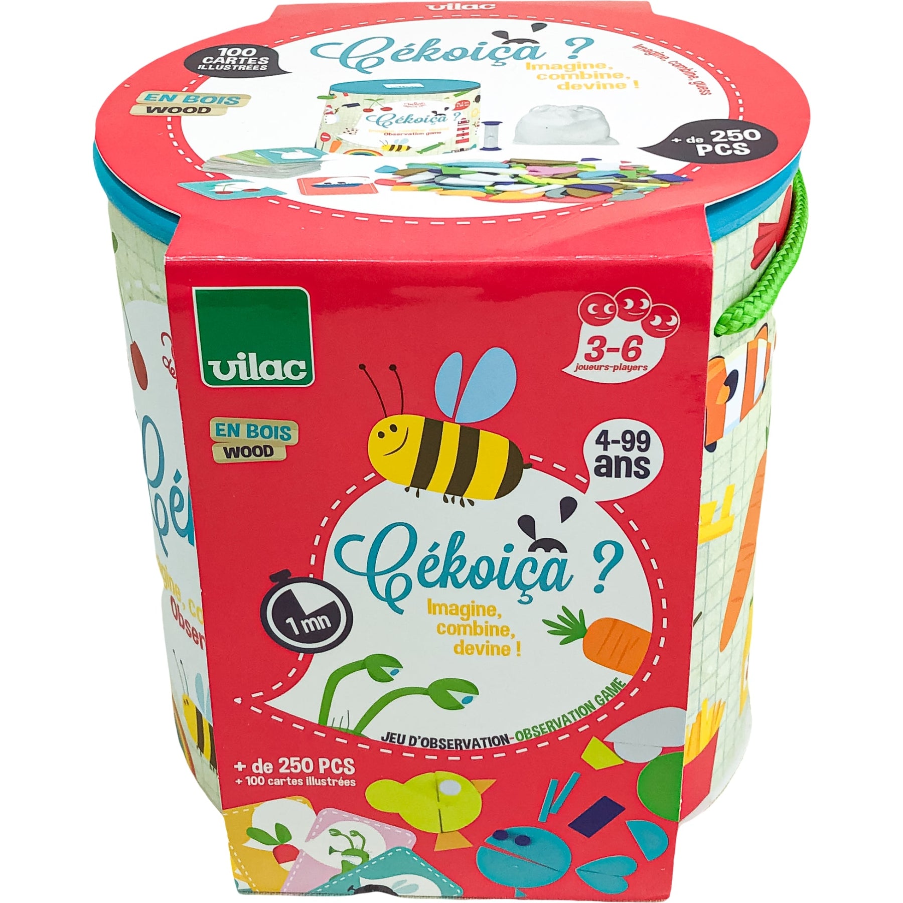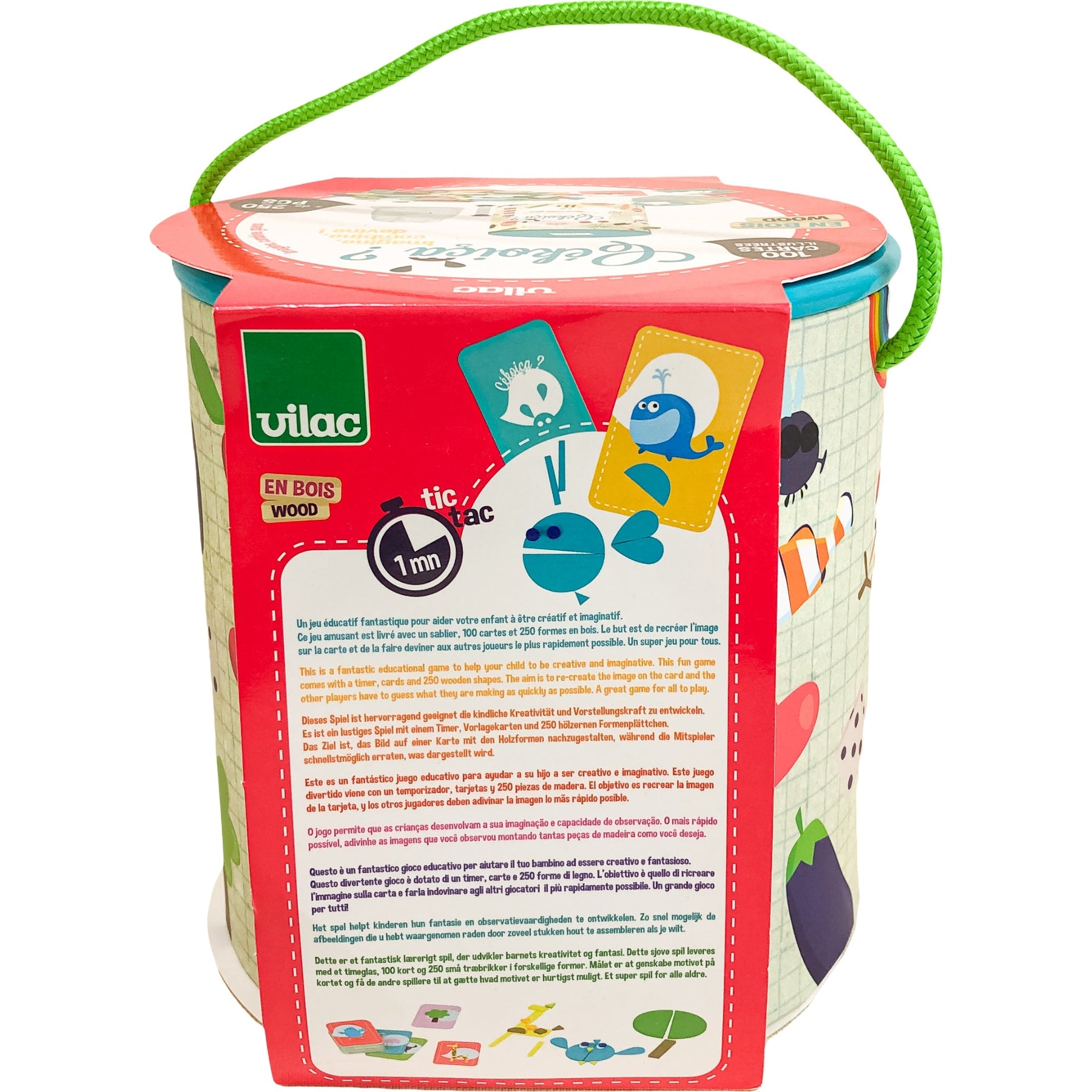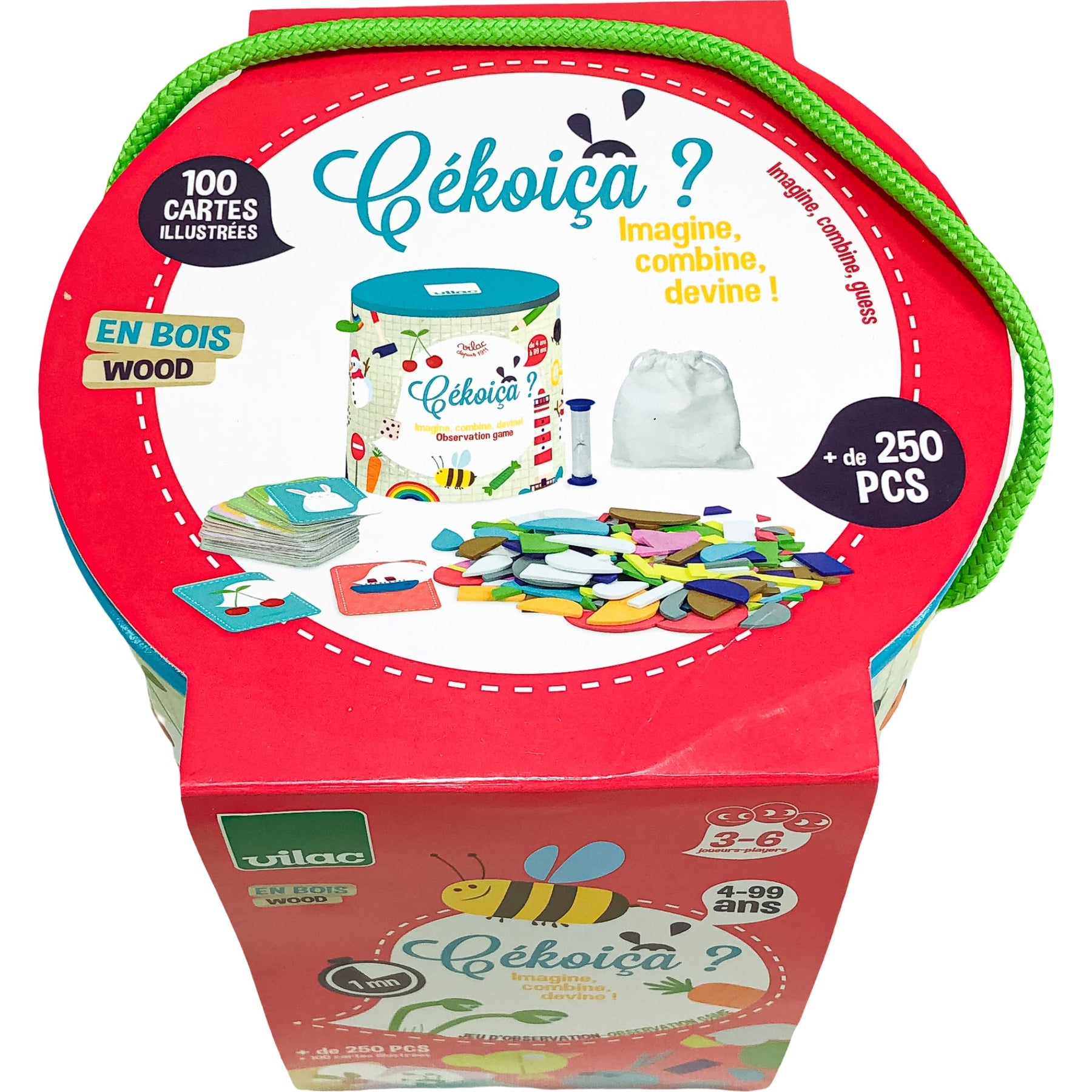 Détail des pièces : 1 sablier, 100 cartes, 250 formes en bois