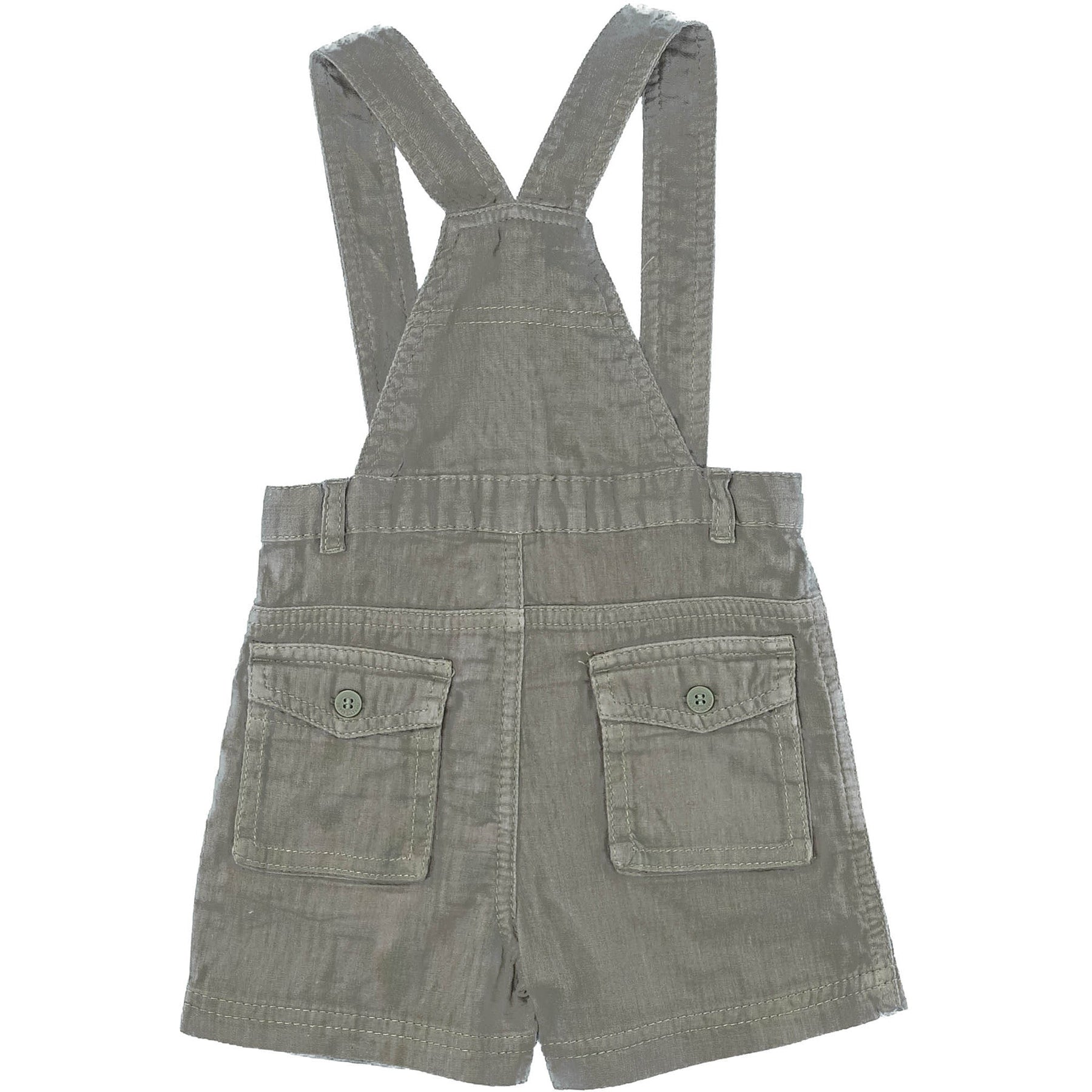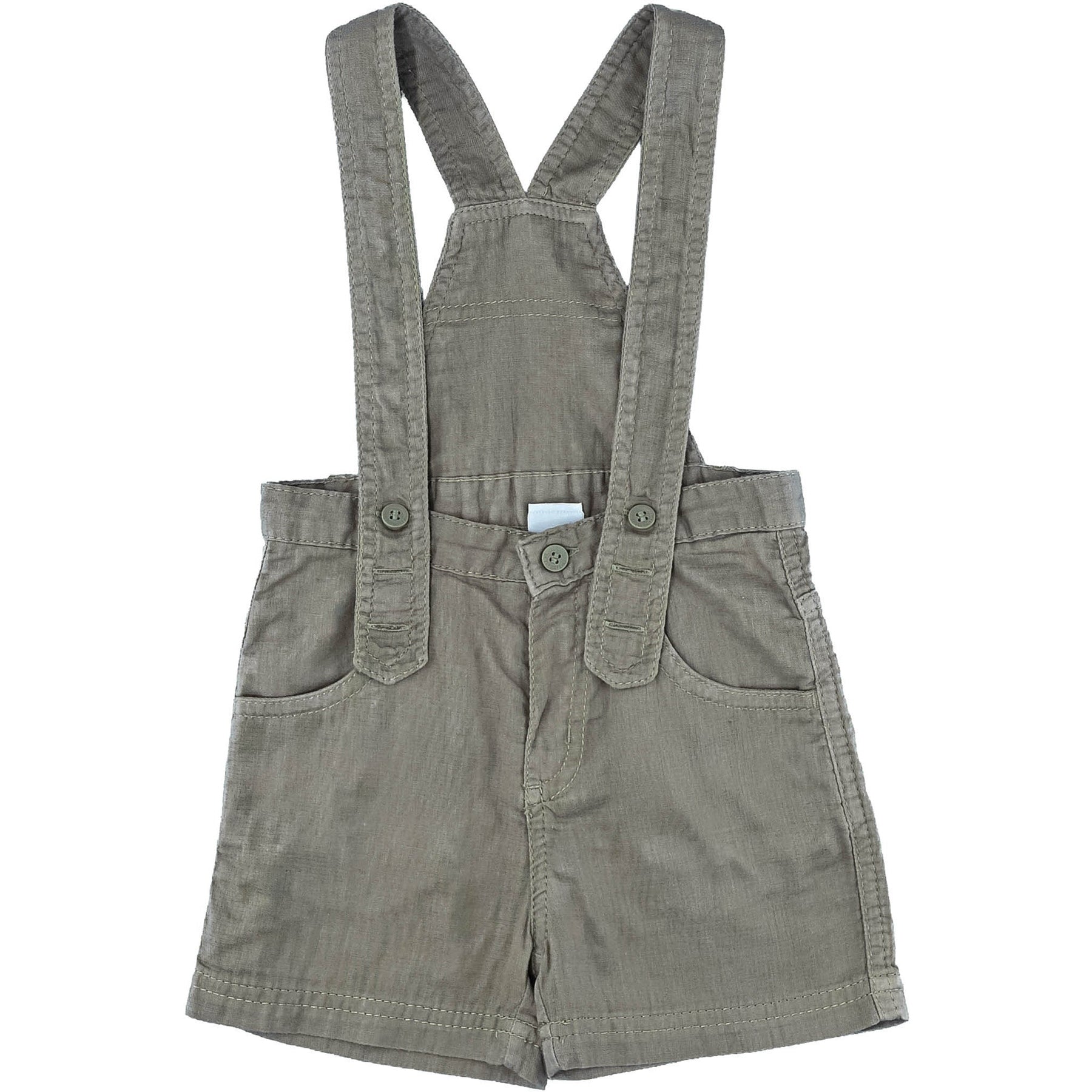 Short à bretelles couleur kaki, Bretelles réglables sur le devant grâce aux boutonnières au niveau de la ceinture, Une pièce parfaite pour une tenue habillée ou de cérémonie